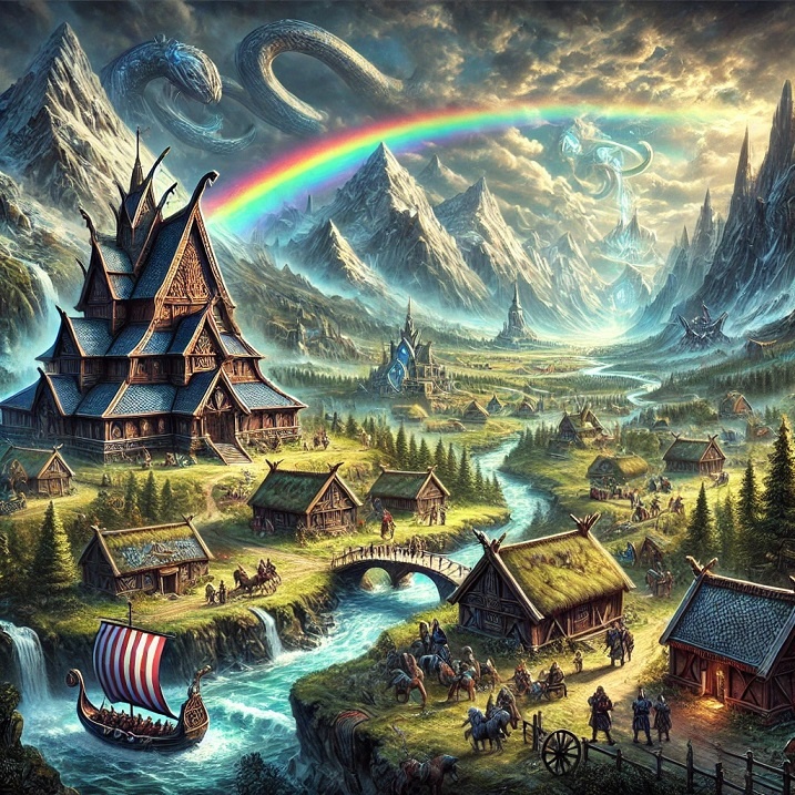 Мидгард — это центральный мир скандинавской мифологии, обитель человечества, созданная богами из останков убитого ими великана Имира. Название «Мидгард» переводится как «Срединная земля» и символизирует мир, расположенный между царствами богов и хаоса. Он защищён от внешних угроз кольцом моря и стенами, воздвигнутыми самими Асами. Но что делает Мидгард таким особенным? Как его представляли древние скандинавы, и какую роль он играет в космологии? Давайте разберёмся! Мидгард — это мир людей, который занимает центральное место в мировом древе Иггдрасиль. Он соединён с Асгардом (миром богов) радужным мостом Бифрёст и окружён бескрайним океаном, в водах которого скрывается огромный змей Ёрмунганд, порождение Локи. В отличие от Асгарда, где обитают бессмертные Асы, или Хельхейма, где царит холодная смерть, Мидгард — это поле битвы, место жизни, испытаний и роста. Люди здесь обретают силу через трудности, принимают решения, куют свою судьбу и готовятся к великой битве — Рагнарёку. Согласно «М