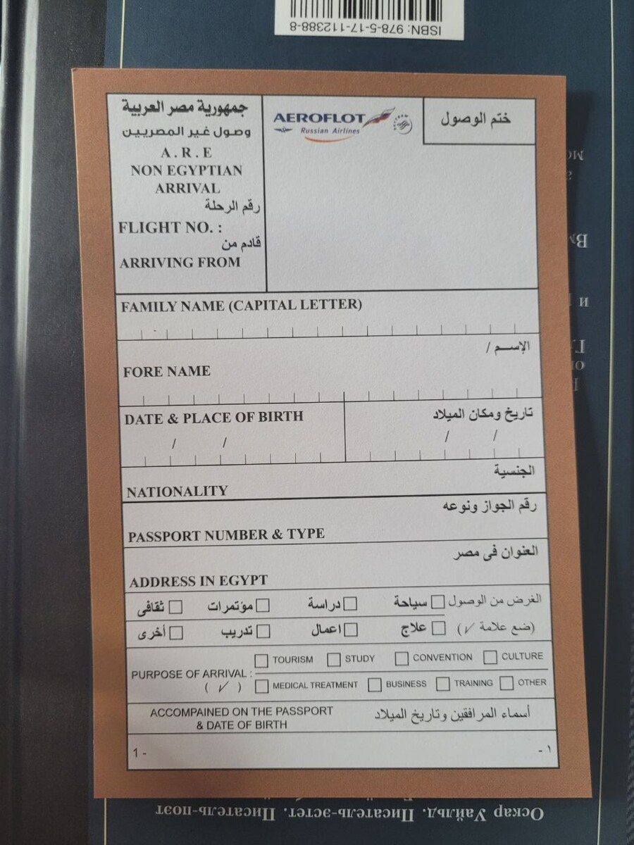 Во-вторых, во время полета в Египет "Аэрофлот" раздал каждому пассажиру пустую миграционную карту. Заполнила я ее буквально за минуту, так как в телефоне был заранее сделанный скриншот образца от "Библио Глобуса".