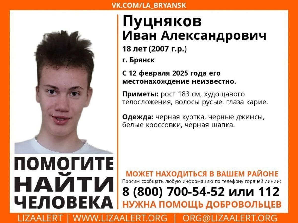 Брянский юноша Иван Пуцняков бесследно исчез позавчера, 12 февраля. Об его местонахождении ничего не известно пока. Тревожную информацию распространил поисковый добровольческий отряд “Лиза Алерт”-Брянск. В Брянске и области ищут будто сквозь землю провалившегося 18-летнего Ивана Пуцнякова. Сообщение об его бесследном исчезновении с фотоориентировкой появилось в официальном паблике брянского поисково-спасательного отряда «Лиза Алерт». Юноша пропал 12 февраля 2025 года. Этот улыбчивый и рослый парень – его рост 183 сантиметра. Он худощавого телосложения с русыми волосами и карими глазами. В день исчезновения Ванюша был одет в черную куртку и такого же цвета джинсы и шапку, белые кроссовки. «Всем, кто располагает сведениями о местонахождении Ивана, просьба позвонить по бесплатным телефонам: 88007005452 (Горячая линия ЛА) или 02, 112″, – говорится в сообщении поискового отряда.