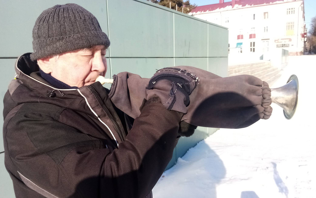 На улице легкий морозец, поэтому свою трубу Гадель Агзамович предварительно укутал специальным чехлом. Человек, который воспитывался в Серменевском детдоме, смеётся: