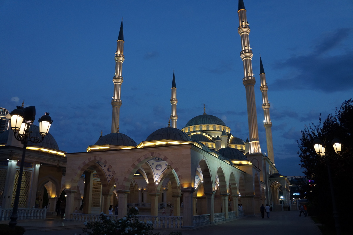 Конечно же мы пошли посмотреть мечеть Сердце Чечни. С подсветкой и фонарями смотри волшебно. Когда мы подошли к мечети начался призыв к вечерней молитве.