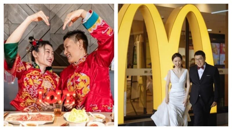 Традиционные китайские свадьбы известны своей экстравагантностью, но молодое поколение предпочитает более сдержанный подход при выборе места проведения торжества, который позволяет им избежать сложных ритуалов, не беспокоиться о погоде и, конечно же, сэкономить. Так, молодые китайские пары отказываются от пышных свадебных церемоний в пользу дешёвых и весёлых торжеств в сетевых ресторанах быстрого питания, таких, как McDonald’s и Haidilao. В отличие от свадеб в роскошных отелях, которые часто требуют внесения крупных депозитов за аренду помещения и кейтеринг, бронирование ресторана фастфуда можно оформить за минимальную сумму. Кроме того, такие места создают веселую молодёжную атмосферу для этого важного дня. Например, сотрудники популярной китайской сети Haidilao украсят стол веточкой и даже споют свадебные песни для пары и их гостей. А в «Макдоналдсе» китайские пары могут заказать свадебные букеты из макнаггетсов. Другие китайские пары могут устроить свадьбу в деревенском доме, отказ