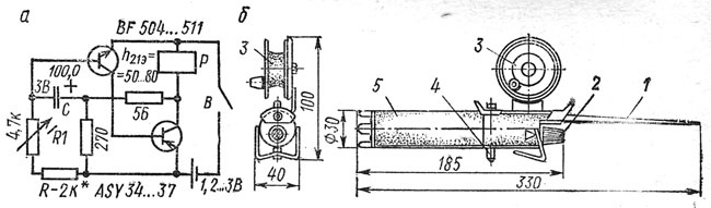 1. Рыбацкий термометр. Многие радиолюбители увлекаются также рыбной ловлей. Предложим им несколько интересных и полезных тем. Устройство... поможет определить границы (глубины) отдельных слоев воды, температура которых соответствует пребыванию определенных видов рыб. Это термисторный термометр, который медленно опускают в воду с помощью удилища, снабженного вертушкой. Одновременно наблюдают за показаниями прибора, шкала которого проградуирована в градусах Цельсия. Затем вынимают термометр и измеряют глубину его погружения. При ловле определенного вида рыбы леска должна иметь соответствующую длину. Приближенные значения температуры воды, при которой различные рыбы чувствуют себя лучше всего, следующие: форель в озере +6, форель в реке +14, линь +15,5, щука +17,7, лещ +18, плотва +19, карась +20, карп +20,5 и окунь +21" С, Точные данные можно найти в книгах по разведению рыб. 2. Электронная удочка. Опытные рыбаки знают, что окунь и другая рыба лучше «клюет», когда крючок вибрирует с част