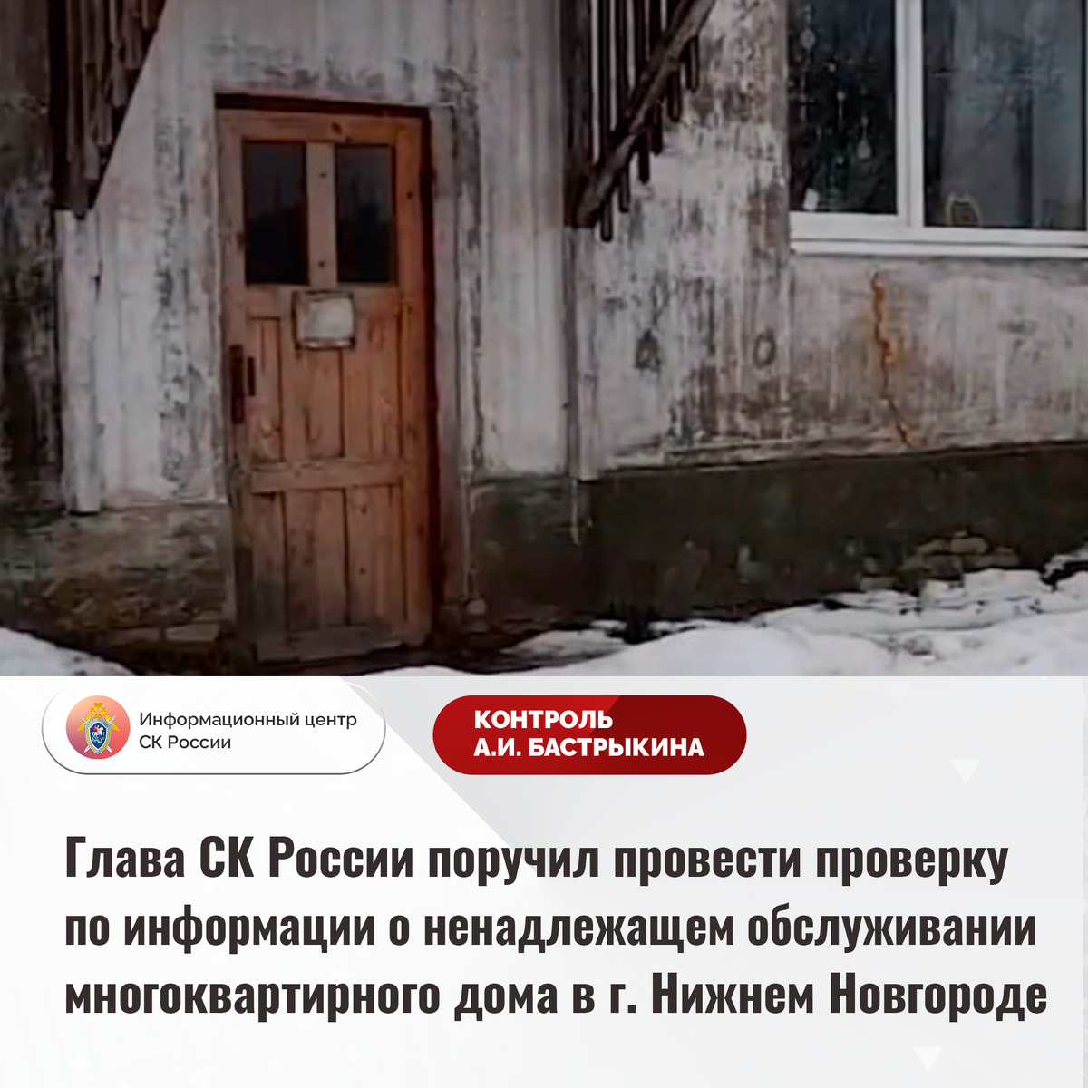 Глава СК России поручил провести проверку по информации о ненадлежащем обслуживании многоквартирного дома в г. Нижнем Новгороде В СМИ и социальной сети сообщается о ненадлежащем обслуживании многоквартирного дома на улице Луговой поселка Красные Баки Нижегородской области. Длительное время фундамент, фасад, кровля и потолочные перекрытия здания, 1964 года постройки, разрушаются, в помещениях образовалась плесень, имеется угроза обрушения кирпичной кладки на пешеходную зону. Отмечается, что капитальный ремонт запланирован только на 2029 год. Председатель Следственного комитета Российской Федерации Александр Иванович Бастрыкин поручил руководителю СУ СК России по Нижегородской области Айрату Саетовичу Ахметшину провести процессуальную проверку и доложить о ее предварительных и окончательных результатах. Исполнение поручения, а также ход процессуальной проверки поставлены на контроль в центральном аппарате ведомства. #СледственныйКомитет #СКРоссии #СКР #ИЦСКР #ИнформационныйЦентр #Алексан