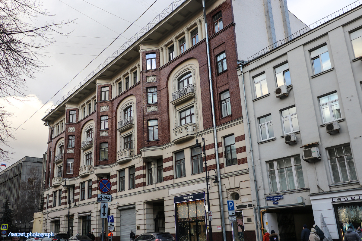 Со стороны улицы это нарядный, торжественно смотрящийся пятиэтажный доходный дом с великолепным модерновым фасадом, украшенным треугольными эркерами и неглубокими арочными нишами с балконами. Но мало кто знает, какие тайны он хранит до сих пор.