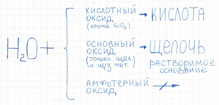 1. Основные оксиды щелочных и щелочноземельных металлов взаимодействуют с водой при комнатной температуре с образованием растворимых оснований — щелочей. Схема данных реакций: Ме₂О+ H₂O = 2МеOH или МеО+ H₂O = Ме(OH)₂ Реакции протекают по типу соединения с выделением большого количества тепла, т. е. являются экзотермическими. Например, Na₂О + H₂O = 2NaOH BaO + H₂O = Ba(OH)₂ Внимание! Это относится только к оксидам следующих металлов: Li, Na, K, Rb, Cs, Ca, Sr и Ba. Оксиды остальных металлов с водой не реагируют! 2. Кислотные оксиды, вступая в реакцию с водой, образуют соответствующие кислородсодержащие кислоты. Именно поэтому их называют ангидридами соответствующих кислот. Ангидрид — это оксид, соответствующий определенной кислоте. Ангидриды в неорганической химии — солеобразующие оксиды, проявляющие кислотные свойства. Исключение: SiO₂ — с водой не реагирует! Схема данных реакций: кислотный оксид + H₂O = соответствующая кислородсодержащая кислота SO₃ + H₂O = H₂SO₄ P₂O₅