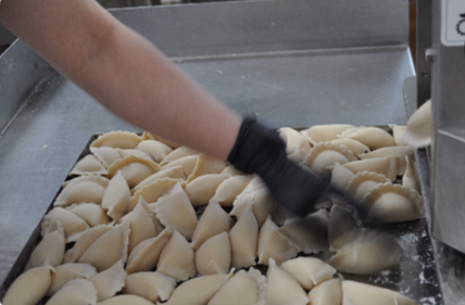 У каждого в процессе свои чёткие задачи. Татьяна Максимова и Елена Мартынова – мастера по замесу фарша, они же готовят творожную массу для вареников и сырников. Лариса Итпекова отвечает за эластичность теста. Ольга Романовская и Елена Канонович – гуру ручной лепки, в их ведении манты и тефтели. Дарья Воронина и Елена Богданова – операторы, их задача правильно выставить все режимы на машинках и рассортировать готовую продукцию на листах для последующей заморозки. А благодаря фасовщику Максиму Дукину мы получаем готовый продукт в красивых фирменных пакетиках.
