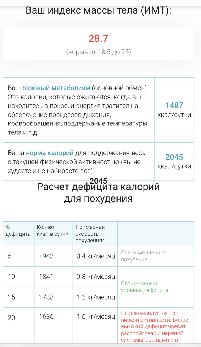 Приветствую на моем канале гостей и подписчиков. Вчера я решила, что раз пока спорта нет пересчитать свою калорийность на февраль. 2000 без спорта это очень много. Ладно в дни цикла, но сейчас это не целесообразно. Мне уже писали, что мое питание больше на массонабор. Хочу заметить, что нет. На данном питании я сбросила к новому году 10 килограмм. И сейчас спокойно сохранила вес и показатели по объемам. Я не гонюсь за большими отвесами. Моя цель не только похудеть, но и закрепить пищевые привычки и восстановить здоровье. Большие отвесы это путь в никуда, чем быстрее идет потеря веса, тем быстрее все вернуться. Еще и друзей прихватят. Итого на сегодняшний день мы имеем такую картину расчета. Оптимальный процент дефицита не больше 15%. Я решила, что остановлюсь на 1800 калорий в день. Надеюсь, что данное изменение мой организм и нервная система воспримут спокойно. Фетсикрет предложил 1900, но я не ориентируюсь на расчет приложения. Мне кажется оно не корректным. Мне на этой неделе