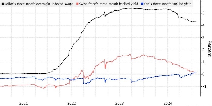 Иена в понедельник пережила укрепление доллара, начавшееся после того, как президент США Дональд Трамп ввел новые тарифы. Это говорит о том, что инвесторы по-прежнему видят ценность японской валюты как убежища в неспокойные времена Динамика японской иены и швейцарского франка. Источник: Bloomberg Курс иены вырос на 0,3% по отношению к доллару, но быстро вернулся к уровню 155,61 в середине торговой сессии в Токио. Евро упал более чем на 1% по отношению к американской валюте, как и канадский, австралийский и новозеландский доллары. Японские государственные облигации также пользовались спросом на фоне падения акций в стране. Относительная устойчивость иены в понедельник — не разовое явление. Это единственная валюта из Группы 10, которая укрепляется по отношению к доллару в этом году. Бегство от рисков также проявилось в падении фондовых рынков по всей Азии после того, как Трамп выполнил свою угрозу ввести общие пошлины в размере 25% для Канады и Мексики и 10% для китайских товаров начиная