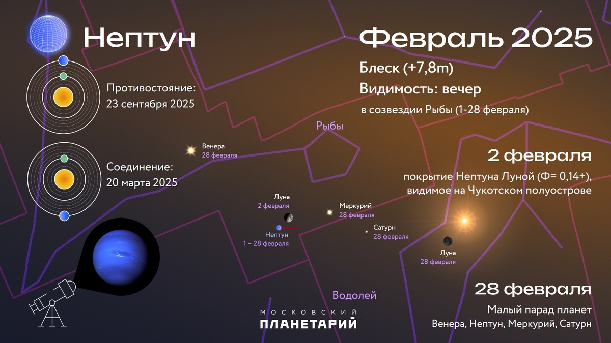 Друзья, в 2025 году каждый месяц мы будем рассказывать самое интересное о планетах на инфографике. На ней будут отражены важные моменты для каждой из планет в данном месяце: 1. По каким созвездиям движется планета в течение месяца.Красной линией будет обозначен путь движения планеты по созвездиям (в центре рисунка). 2. Видимость планеты. В какое время суток можно наблюдать планету (вечер, ночь. утро) или она будет не наблюдаема (вблизи соединения с Солнцем). 3. Блеск планеты (звездная величина (+-0,0m)) и его изменение в течение месяца. 4. Соединение и противостояние планеты с Солнцем в 2025 году. Зная эти даты, вы легко сможете определить, когда наблюдать планету. Наилучшее время для наблюдения планеты – это месяц до и после ее противостояния (для далеких планет). В период противостояния планета наблюдается высоко над горизонтом в полночь как яркое светило (Марс, Юпитер и Сатурн). Для Меркурия и Венеры лучшее время для наблюдения – это моменты их наибольшего удаления от Солнца (э