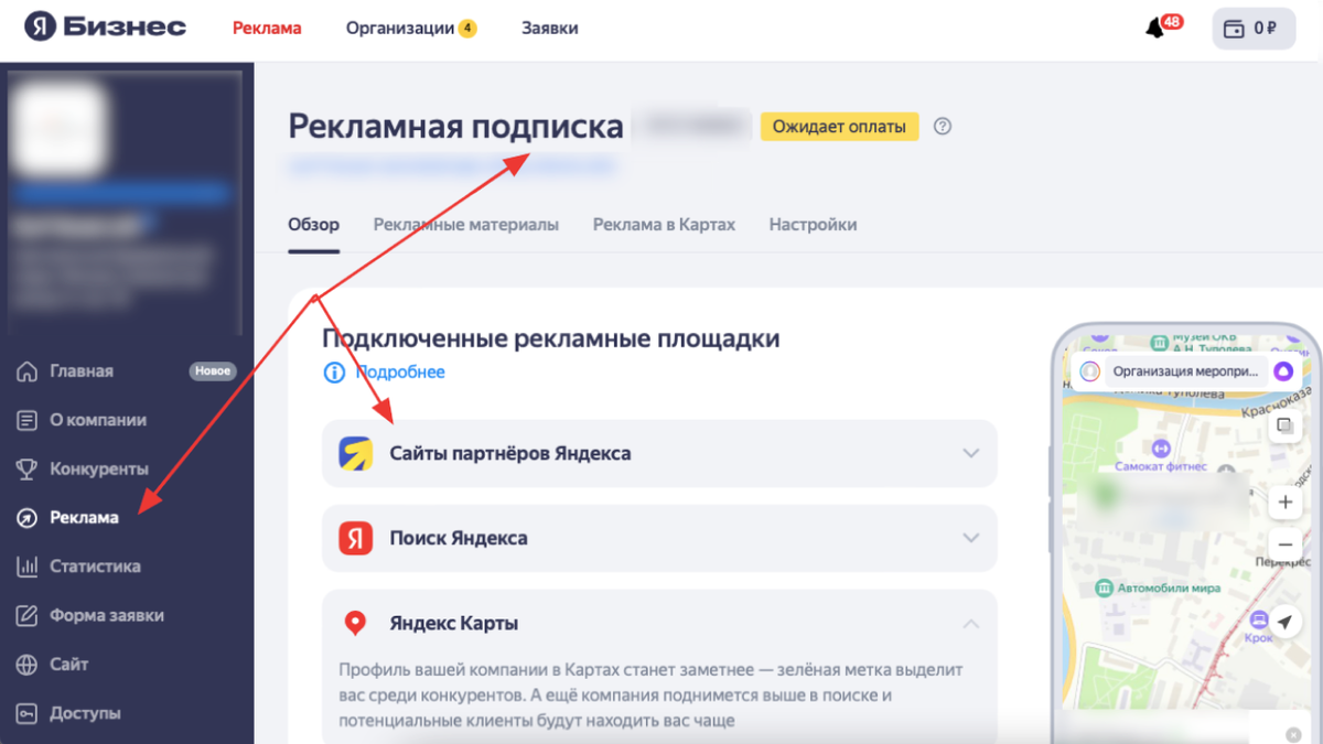 Для заполнения переходим на «Рекламу в картах»
