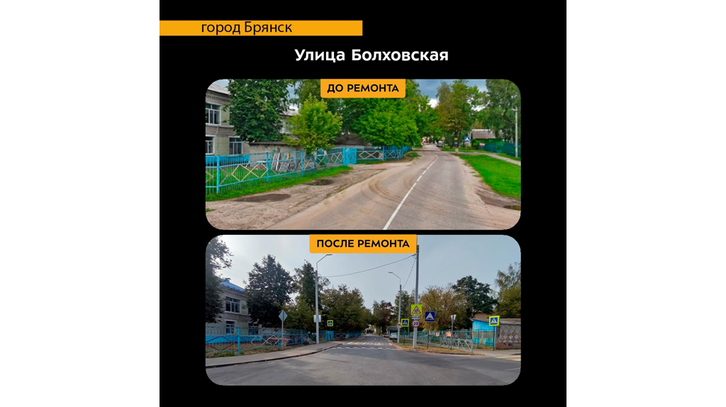В 2024 году в Бежицком районе Брянска капитально отремонтировали участок дороги по улице Болховской. Работы велись по национальному проекту «Безопасные качественные дороги». Обновлён участок протяженностью 1,8 км от улицы Литейной до улицы Союзной. Уложен новый асфальт, построены тротуары, которых здесь раньше никогда не было. На улице к уже имеющемуся освещению добавили светодиодные светильники. Возле школы сделалана парковка. Брянцам показали фото дороги до и после ремонта. Снимок опубликовала пресс-служба регионального управления автодорог. В 2025 году запланированы масштабные работы по национальному проекту «Инфраструктура для жизни». Он станет преемником «Безопасных качественных дорог». Брянцам показали фото улицы Болховской до и после ремонта