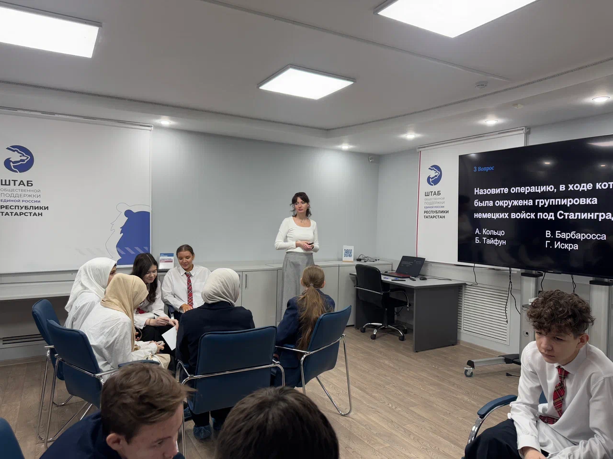 В Штабе общественной поддержки «Единой России» в Республике Татарстан прошли мероприятия, посвященные Дню победы советских войск в Сталинградской битве. Открыл событие руководитель Штаба Камиль Садриев: «Сталинградская битва — это пример несгибаемой воли, единства и самопожертвования во имя Родины. Наш долг — помнить этот подвиг и рассказывать о нем молодежи, чтобы они осознавали цену мира и ответственности за его сохранение». Для учащихся лицея №35 прошла интеллектуальная игра «Бәйге» на тему «Сталинградская битва». Юрист Штаба Екатерина Корюкова выступила в роли ведущей, и проверила, насколько глубоко школьники знакомы с историей одного из самых значимых сражений того времени. Игра состояла из четырех раундов, в каждом из которых было по пять вопросов о ходе битвы, ее героях, ключевых событиях и влиянии на исход войны. После ученики лицея поучаствовали в проекте «Весточка» и отправили открытки ветеранам, принимавшим участие в битве за Сталинград. Продолжением мероприятия стал просмот
