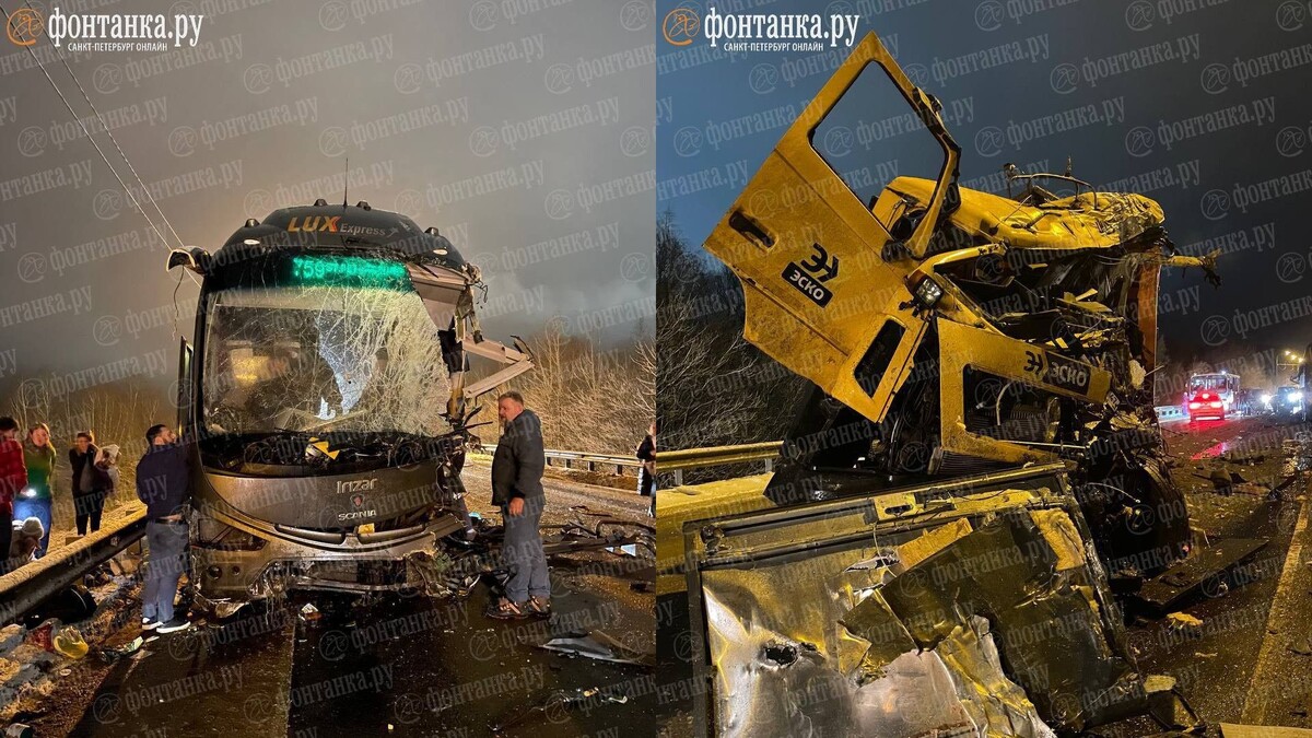 Как пишет «Фонтанка», на борту автобуса Lux Express, который вез людей от эстонской границы в Петербург, находились 22 пассажира и водитель. В автобусе было трое граждан Эстонии, 16 граждан РФ, два гражданина Германии, гражданин Молдовы и гражданин Польши. В аварии пострадали 18 человек. На месте погибли два пассажира автобуса — 60-летняя женщина и ее 61-летний супруг. В крайне тяжелом состоянии госпитализированы оба водителя. У 39-летнего мужчины, сидевшего за рулём спецтехники, открытая черепно-мозговая травма, переломы ног, руки и костей таза. У 49-летнего водителя автобуса разрыв селезёнки и переломы ног. Также в больницу увезли двух пассажиров автобуса, среди которых 11-летний мальчик и 37-летний мужчина. 11-летнего мальчика отвезли в больницу с открытой черепно-мозговой травмой, переломами костей черепа и двух позвонков.