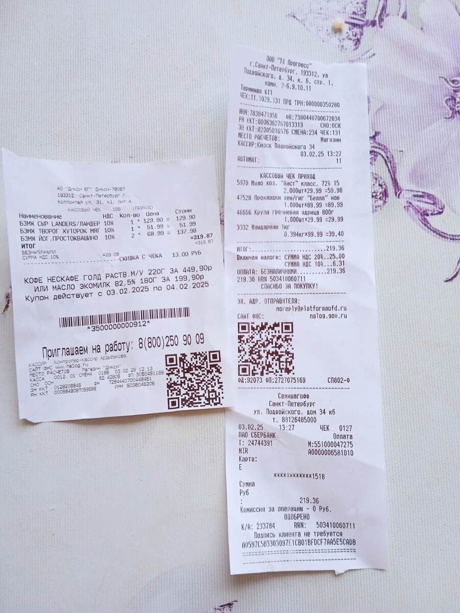 Почти 320 рублей заплатила за эти продукты. Скидка составила 13 рублей. Специально сфотографировала чеки отдельно. Ниже будет фотография покупок, но чеки плохо видно на той фотографии.