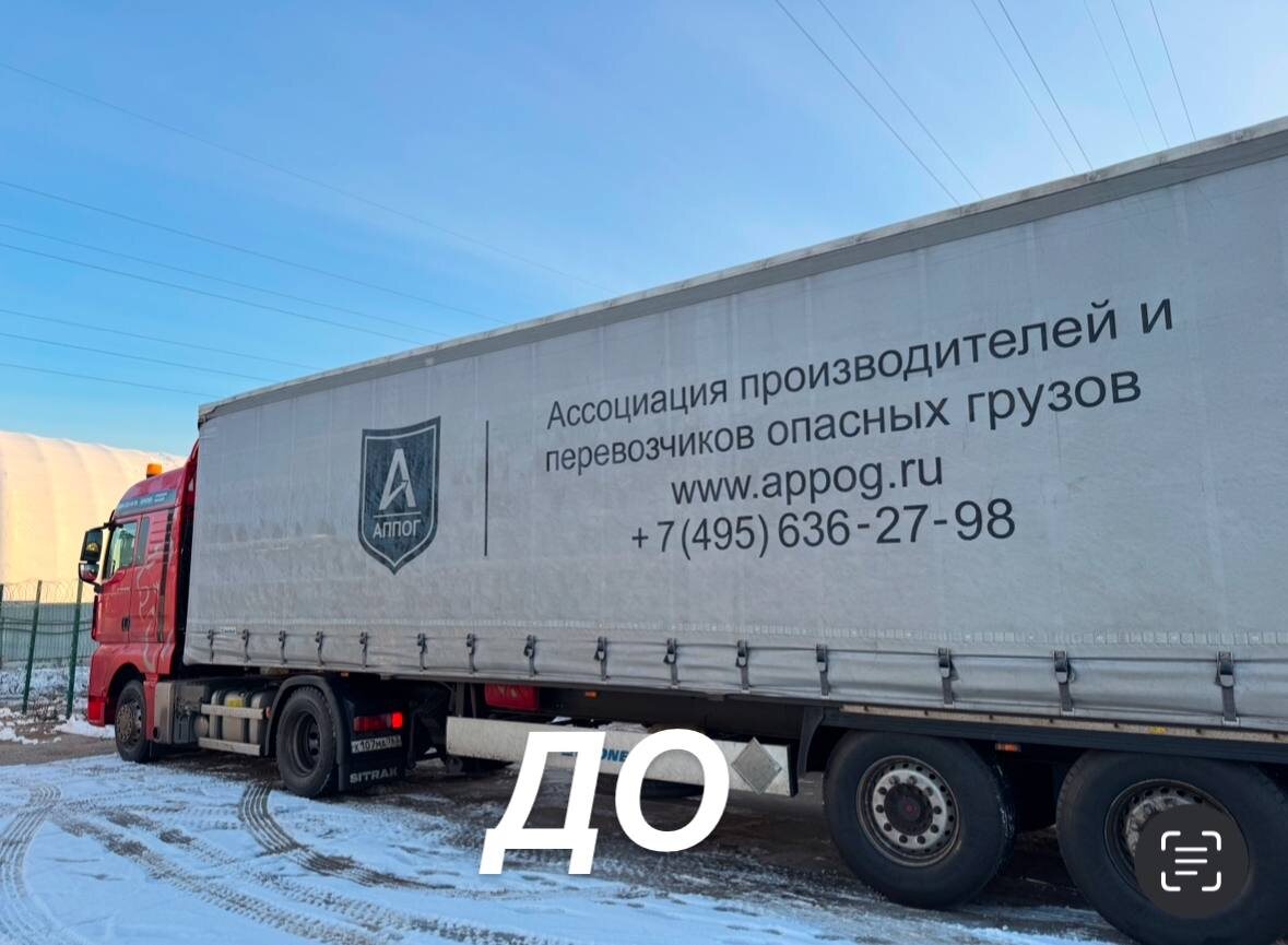 К нам обратилась компания, которая приобрела полуприцепы с чужой рекламой. Им необходимо было убрать текст с тента. Сперва они попробовали самостоятельно стереть буквы с тента, но тем самым лишь повредили слой пвх и поцарапали лак.