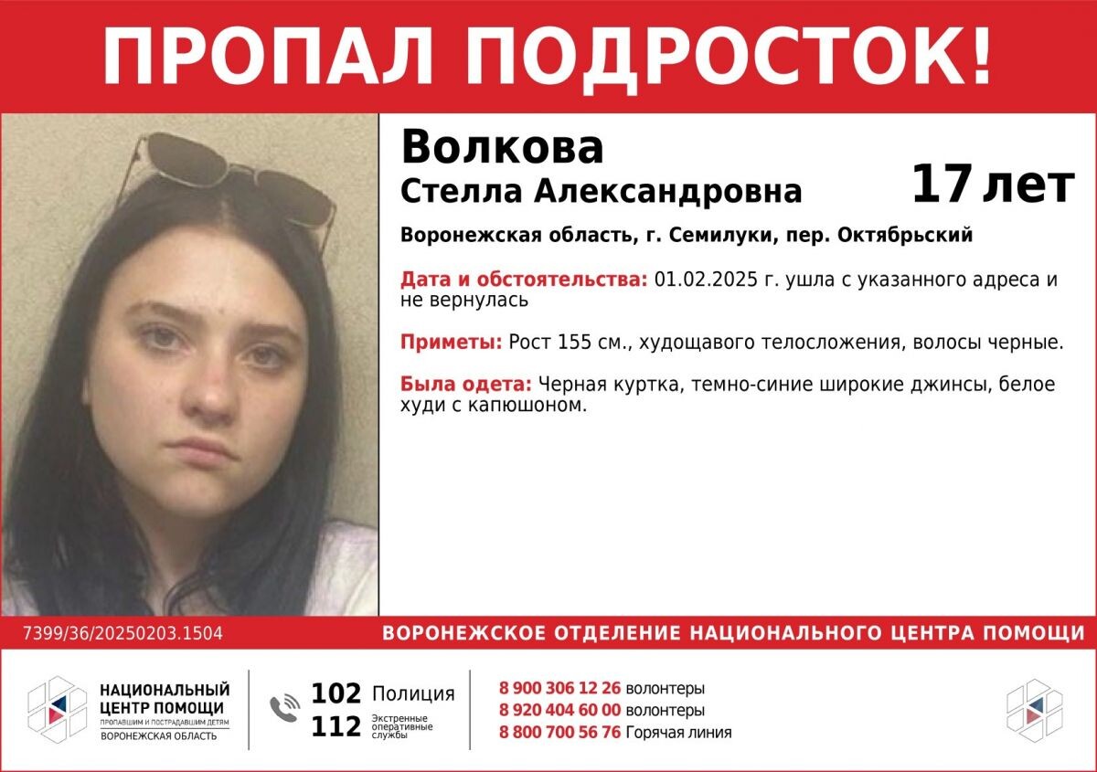 В Воронежской области объявили поиски 17-летней Стеллы Волковой, пропавшей без вести 1 февраля. Об этом сообщили представители Национального центра помощи.
