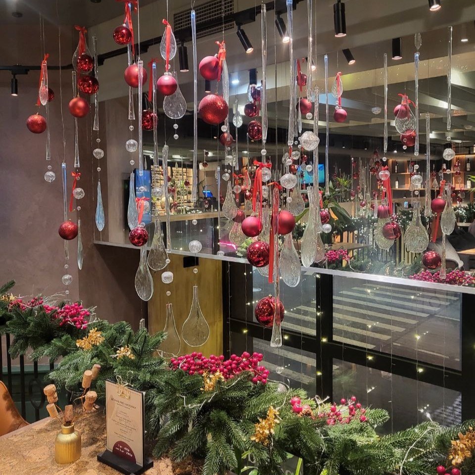 В ресторане всё ещё Новый год - шарики, ёлочки, гирлянды... всё по-зимнему. Снега на улице нет, но настроение сразу улучшается.