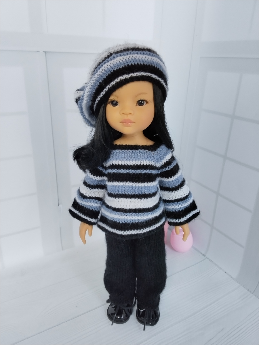Пряжа - Alize Angora Gold (550 м / 100 грн.) - черная нить. Alize Lanagold 800 (49% шерсть,51% акрил, 730 м/100гр) - голубая и белая нить. Спицы √2. Свитер. Черная нить. Набираем 47 п. 1. Кром., планка (1 лиц., 1 изн.), 41 изн., планка (1 изн., 1 лиц.), кром. 2. Кром., планка(1 изн., 1 лиц.), 41 изн., планка(1 лиц., 1 изн.) Если свитер будет застегиваться на пуговички, делаем дырочки в начале 3 ряда и 23. Дальше вяжем по схеме. Голубая нить. 3. Кром., планка(1 лиц., 1 изн.), 4 лиц., 3️⃣ петли реглана - приб., 1 лиц., приб., 9 лиц., 3️⃣, 11 лиц., 3️⃣, 9 лиц., 3️⃣, 4 лиц., планка(1 изн., 1 лиц.), кром. 4. Кром., планка(1 изн., 1 лиц.), все петли лицевые, планка (1 лиц., 1 изн.), кром. 5. Кром., планка (1 лиц., 1 изн.), 5 лиц., 3️⃣, 11 лиц., 3️⃣, 13 лиц., 3️⃣, 11 лиц., 3️⃣, 5 лиц., планка (1 изн., 1 лиц.), кром. Планку уже видно, продолжаем ее вязать, я дальше не буду указывать, и кромочные, чтобы не загромождать описание. 6. Изнаночные петли 7. 6 лиц., 3️⃣, 13 лиц., 3️⃣, 15 лиц., 3️⃣