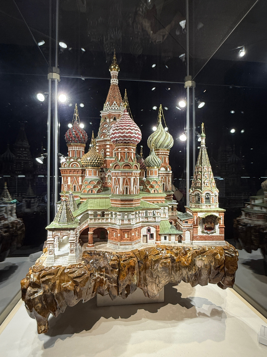 В Историческом музее в Москве проходит невероятно крутая выставка «Россия - любовь моя! Искусство ювелиров России. ХIХ-ХХI век». На ней представлены работы победителей конкурса Гохрана - «Россия. XXI век», мастеров золотого, серебряного и ограночного дела, камнерезного, медальерного, оружейного, часового искусства XXI столетия. Этот конкурс проводится Гохраном при поддержке Министерства культуры Российской Федерации уже 25 лет. В зале камнерезов я зависла надолго, каждую композицию можно рассматривать часами. Представьте, огромный (почти метр на метр) храм Василия Блаженного, сделанный из мрамора, кахолонга, яшмы, офиокальцита, лазурита, агата, кремня и аметиста! Работа мастеров из Екатеринбурга потрясающая, над ней трудилась команда ювелиров, камнерезов, художников, всего почти 20 человек. И результат просто потрясающий! Не менее впечатляющими получились и композиции на исторические и мифологические темы: «Илья Муромец», «Царевна-лебедь», «Ермак», «Святогор и Микула», «Добрыня