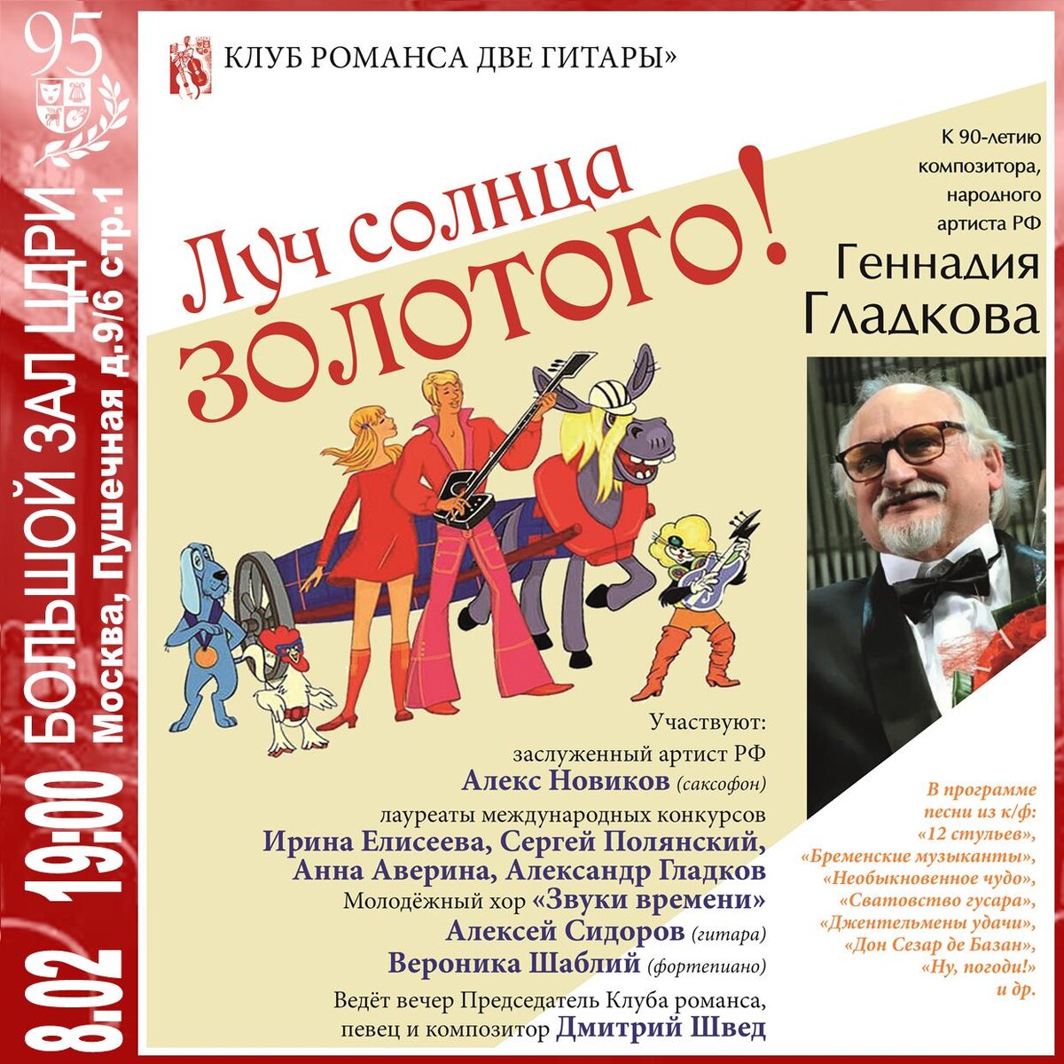 Клуб романса «Две Гитары» к 90-летию композитора Геннадия Гладкова В программе песни из фильмов «Обыкновенное чудо», «Бременские музыканты», «12 стульев», «Сватовство гусара», «Необыкновенное чудо», «Джентльмены удачи», «Дон Сезар де Базан», «Ну погоди!» и др. Участвуют: Заслуженные артисты РФ — Алекс Новиков (саксофон) Лауреаты международных конкурсов