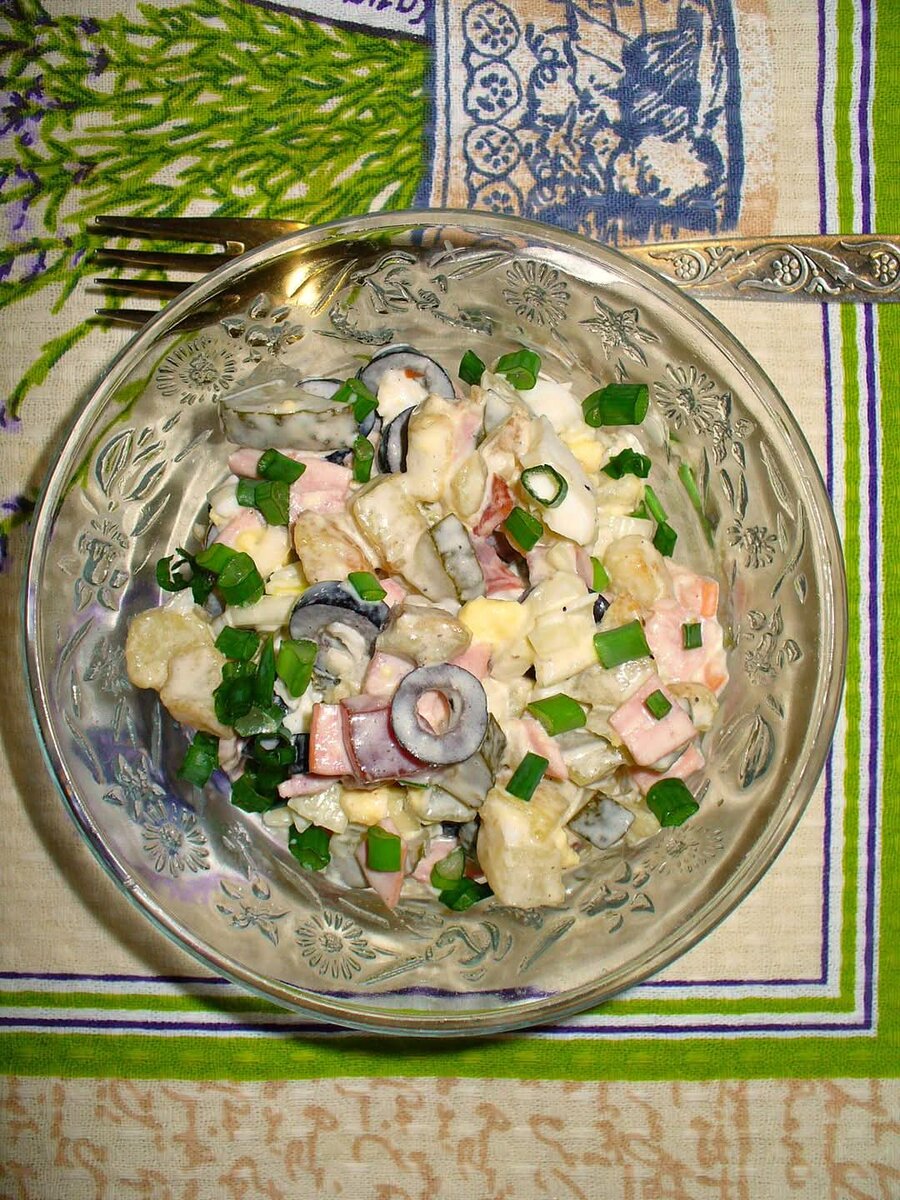 Все продукты я нарезала мелким кубиком. И только маслины — колечками) Добавила соли, свежемолотого черного перца. Заправила майонезом на кукурузном масле. Количество продуктов — по вкусу.