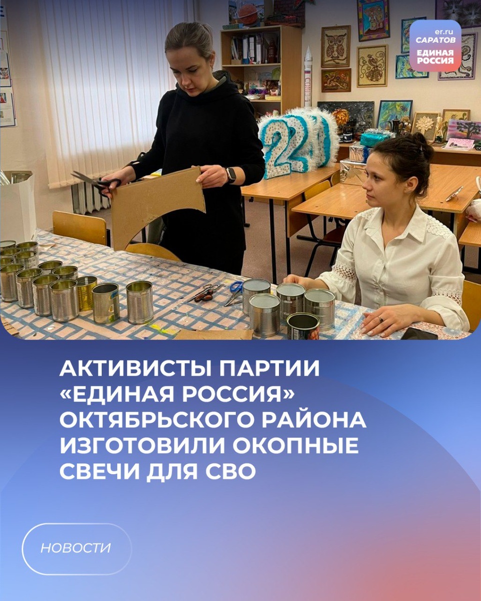 🪖Партия «Единая Россия» оказывает всестороннюю поддержку специальной военной операции с первых дней ее начала. При поддержке местного координатора партийного проекта «Женское движение Единой России» Яны Кондрашовой в Центре дополнительного образования для детей проведён мастер-класс по изготовлению окопных свечей, в котором приняли участие сотрудники учреждения. В ходе мастер-класса изготовлено несколько коробок свечей, которые совсем скоро вместе с гуманитарным грузом будут отправлены в зону специальной военной операции. 💬«Выражаю благодарность всем, кто помогает нам в сборе гуманитарного груза для наших защитников, а также тем, кто принимает участие в изготовлении окопных свечей, тем, кто помогает нам необходимыми материалами. В это непростое время очень важно всем объединиться и поддерживать наших героев, которые стоят на защите нашей Родины», - поделилась Яна Кондрашова.