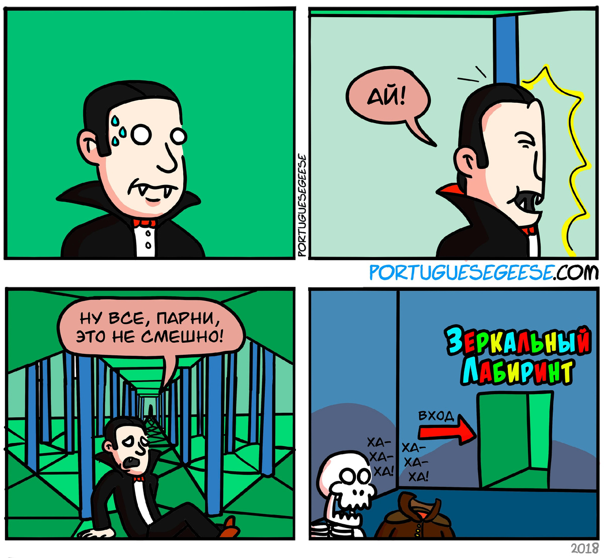 Популярность того или иного образа можно отследить как минимум по тому, как часто он используется в поп-культуре. И довольно часто упоминаемость растет как снежный ком - чем чаще тот или иной персонаж появляется в фильмах, книгах, комиксах и мемах, тем чаще он попадает во все новые и новые произведения. Вампиров, к примеру, точно можно отнести к очень узнаваемым образам - и речь не только о Дракуле, но и о любых зубастых охотниках за кровью. И да, в комиксах вампиры тоже появляются довольно часто: понятный и узнаваемый образ - это всегда отличный повод придумать какую-нибудь новую шутку. И сегодня я как раз собрал для вас десятку отличных зарисовок про вампиров. Надеюсь, что они вам понравятся! Серия комиксов Portuguese Geese («Португальские Гуси») от американского художника Джо Холтби (Joe Holtby) - это смесь абсурда, жизненного юмора и отсылок к известным фильмам, книгам и видеоиграм. Главным героем одного из комиксов, например, стал граф Дракула. Ну и без его веселых друзей дело не