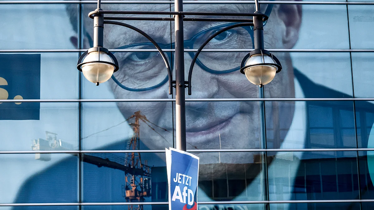 Плакат партии «Альтернатива для Германии» (AfD) на фонаре напротив масштабного предвыборного плаката председателя Христианско-демократического союза Германии (ХДС) Фридриха Мерца, который можно увидеть в штаб-квартире ХДС, доме Конрада Аденауэра, в Берлине, 13 января 2025 года.