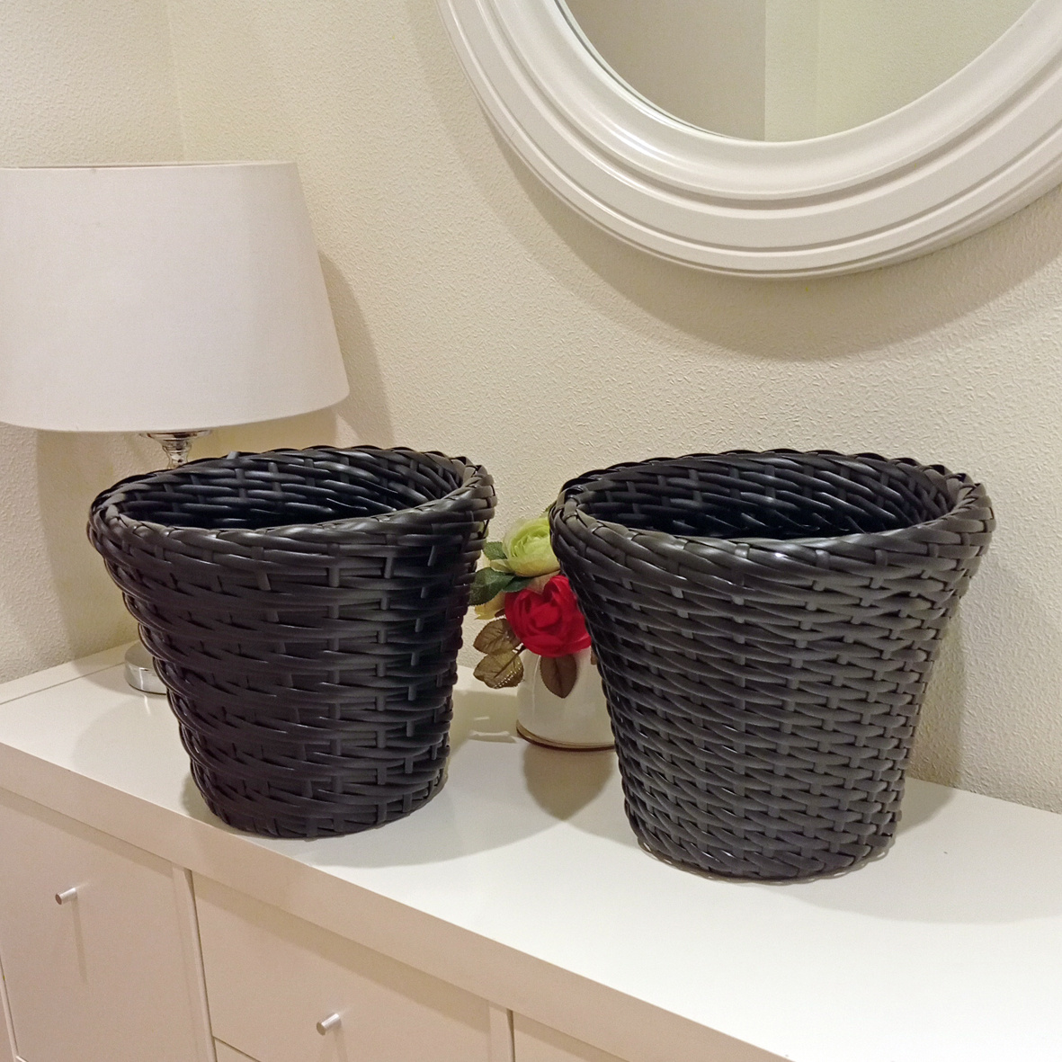 Потом я захотела попробовать другой профиль - полумесяц. И выбрала ротанг и с текстурой, и с фактурой дерева, шириной 8 мм. Выглядит шикарно, как настоящая потемневшая лоза! Опять докупила ведра и тут уже попробовала сделать пузатые формы. В целом ничего сложного, но между лентами немного просвечивает внутренняя пустота. И я разобралась с тем, как разматывать ротанг, чтобы не путался. Надо не раскручивать моток, а снимать сверху кольцами.