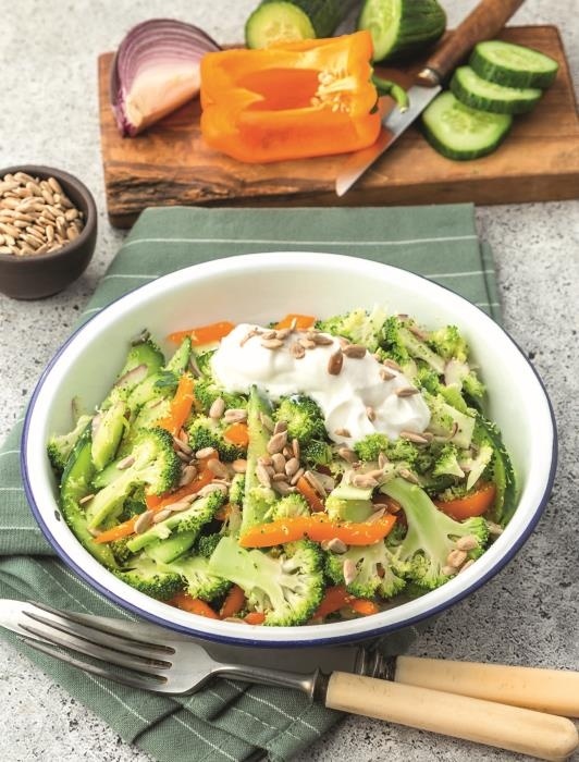 200 г свежей брокколи, 150 г огурцов, 1 сладкий перец, 1/4 красной луковицы, 1/2 ст. ложки лимонного сока, 100 мл греческого или турецкого йогурта, 2 ст. ложки жареных семечек подсолнечника.