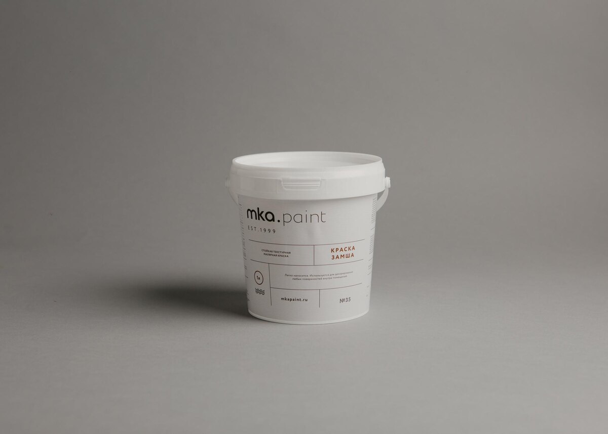 1. Краска Замша - матовая краска для создания текстурного, замшевого покрытия (от 1150р/м20). Самый популярный продукт в линейке mka.paint благодаря текстуре, большой палитре оттенков, антивандальным свойствам и легкой реставрации.