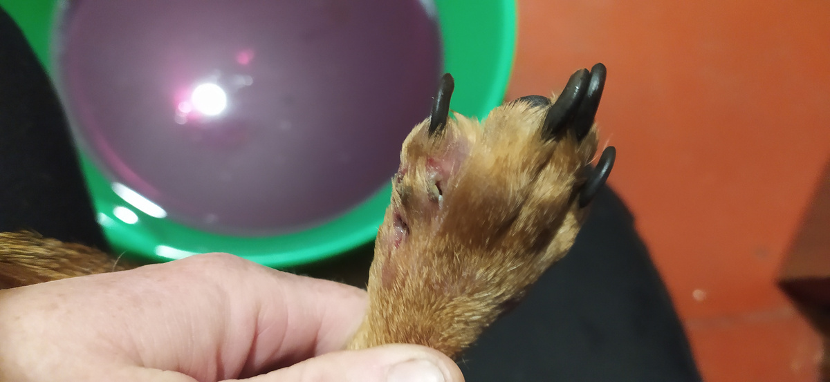 Соне сильно досталось во время драки, теперь лечу собаке лапу.