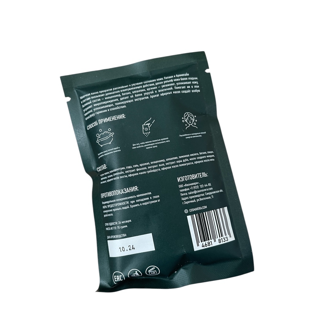 Само молочко это порошок, смесь сухого молока, соды, крахмала, есть ниацинамид, аллантоин, папаин (отшелушивающий компонент, знакомый по энзимной пудре), экстракты и масла, экоголик радуется составу. Запах натуральный, верхние ноты мяты и пихты, пахнет мятными конфетками. Набираем ванну, растворяем пакетик и кайфуем. Порошок быстро растворяется и придает воде молочный цвет. Никаких неприятных ощущений нет, я лежу в такой ванне минут 15-20, далее обмываю водой. Суперэффекта на коже я не увидела, но она не стянута, больше мне понравился аромаэффект.