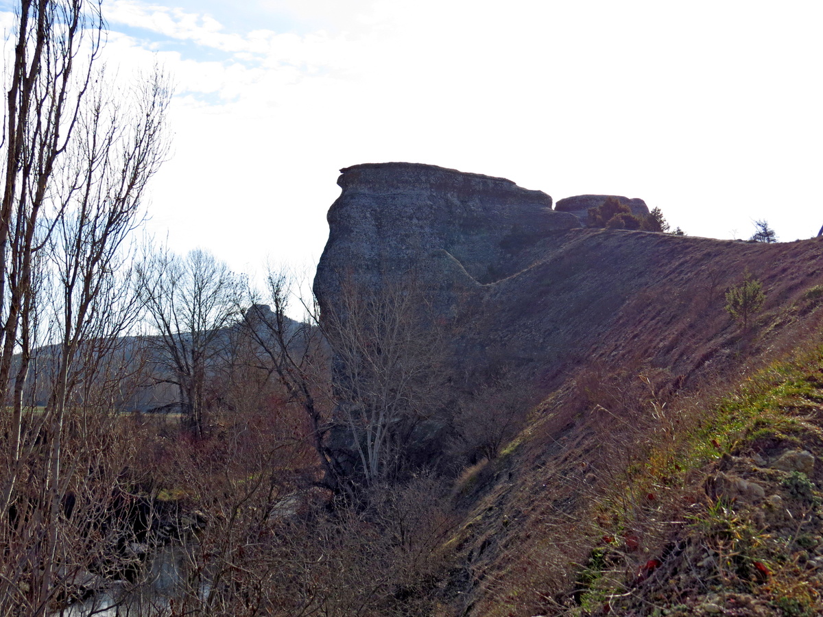 У подножия скалы протекает река Бельбек и в ее сторону скальные обрывы.