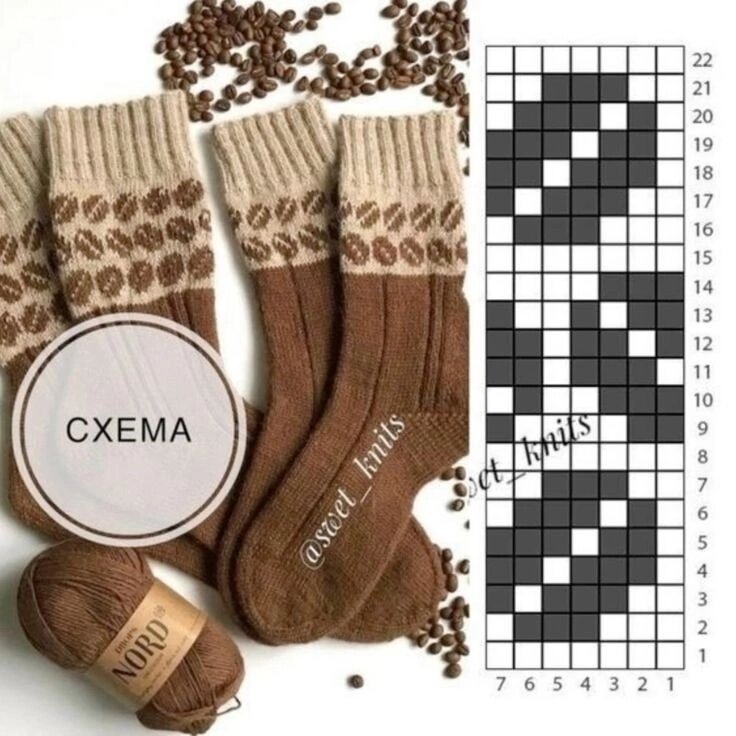 Мой первый, мой кривенький жаккардик. И, конечно, уже сношенный. Все началось, когда я наткнулась в интернете на схему носочков с узором из кофейных зёрен. Идея заворожила! Сразу представила, как эти уютные носочки будут согревать мои ноги в холодные вечера, да еще и под аромат свежесваренного кофе. Очень волновалась. Жаккард казался сложным. Но, когда я взялась за работу, началось настоящее волшебство и узор постепенно вырисовывался на полотне. Это было невероятно! Я даже пыталась представить, как буду носить свои творения и показывать их друзьям. Каждый ряд приближал меня к финишу. Когда носочки наконец были готовы, я не могла поверить, что это мои первые жаккардовые изделия! Теперь они уже сносились. Были штопаны-перештопаны, но оставались моими самыми любимыми. Кофейные носочки не только радовали глаз, но и стали символом моего первого жаккарда. Правда, воспоминания остались лишь в нескольких фотографиях и сохранённой схеме. Это было незабываемое приключение, полное волнен