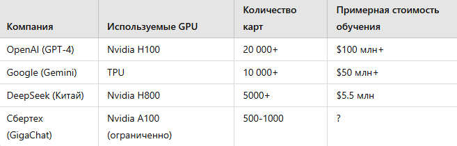Российские компании активно развивают искусственный интеллект, но пока не могут составить конкуренцию OpenAI, Google DeepMind, Meta или даже китайским разработчикам. Почему так происходит? Давайте разберёмся в главных проблемах. Обучение современных нейросетей требует огромных мощностей. Например, GPT-4 обучалась на тысячах GPU Nvidia A100 и H100, а для Google Gemini 1.5 использовались TPU (специализированные процессоры Google для ИИ). В России доступа к таким технологиям нет. После введения санкций Nvidia перестала поставлять A100 и H100, а альтернативные китайские решения (например, Huawei Ascend или Biren BR100) либо недоступны, либо сильно уступают по мощности. Примерное сравнение доступных вычислительных мощностей: График, демонстрирующий рост вычислительных мощностей, используемых в обучении нейросетей. ИИ-модели обучаются на огромных массивах данных. OpenAI и Google используют всю доступную информацию в интернете, включая Wikipedia, Reddit, Stack Overflow, научные статьи и книги