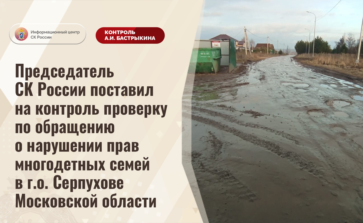Председатель СК России поставил на контроль проверку по обращению о нарушении прав многодетных семей в г.о. Серпухове Московской области В комментариях в аккаунте приёмной Председателя СК России А.И. Бастрыкина «ВКонтакте» размещено обращение по вопросу нарушения прав многодетных семей в городском округе Серпухове. Несколько лет назад гражданам выданы земельные участки на территории города Пущино без необходимых коммуникаций и инфраструктуры. Местные жители ежедневно испытывают трудности при передвижении по неасфальтированной дороге. Несмотря на наличие вступившего в законную силу судебного решения, мер к его исполнению не принимается. Ранее указанная ситуация освещалась в СМИ. В ГСУ СК России по Московской области начата процессуальная проверка. Председатель Следственного комитета Российской Федерации Александр Иванович Бастрыкин поручил и.о. руководителя ГСУ СК России по Московской области Ярославу Александровичу Яковлеву представить доклад о предварительных и окончательных результат