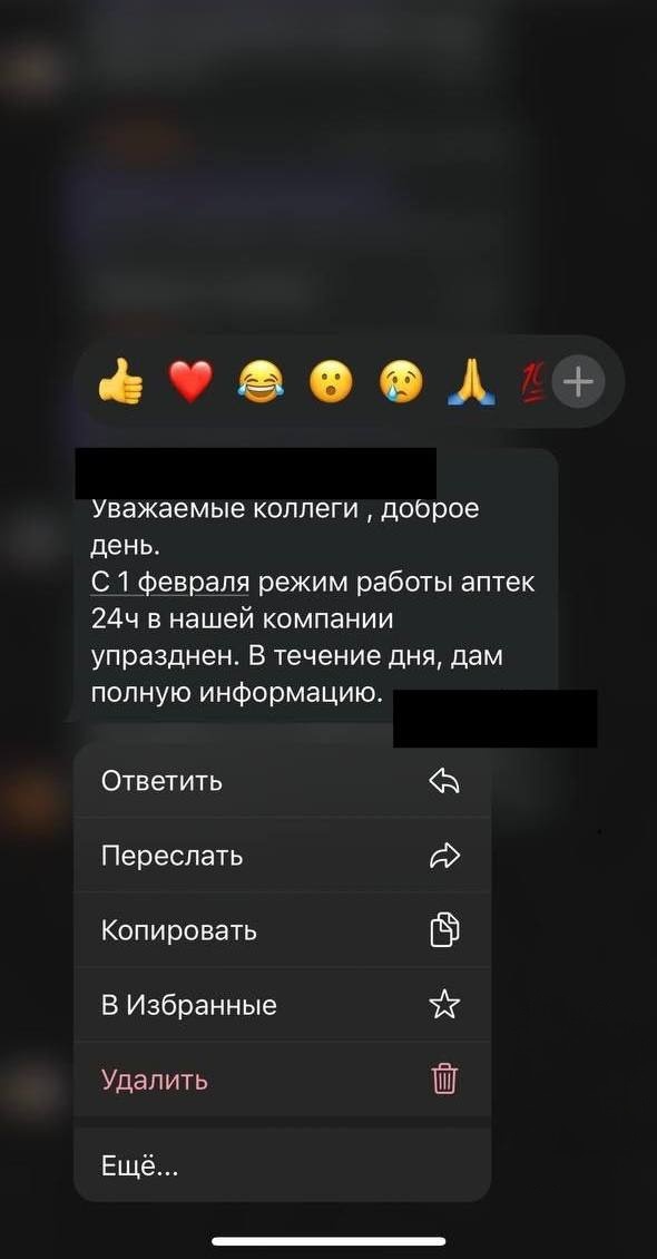 Сообщения о сокращениях приходят от работавших в ночные смены сотрудников аптек "Апрель" из Твери, Краснодара и Петербурга. Со слов уже экс-сотрудников, им 30 января руководство сообщило о сокращении ночной ставки с февраля 2025 года с просьбой написать заявления по собственному желанию. По словам бывших работников, сеть планирует отказаться от круглосуточной работы аптек, а сотрудникам предложили работать в дневные смены или в аптеках, находящихся на другом конце города.
