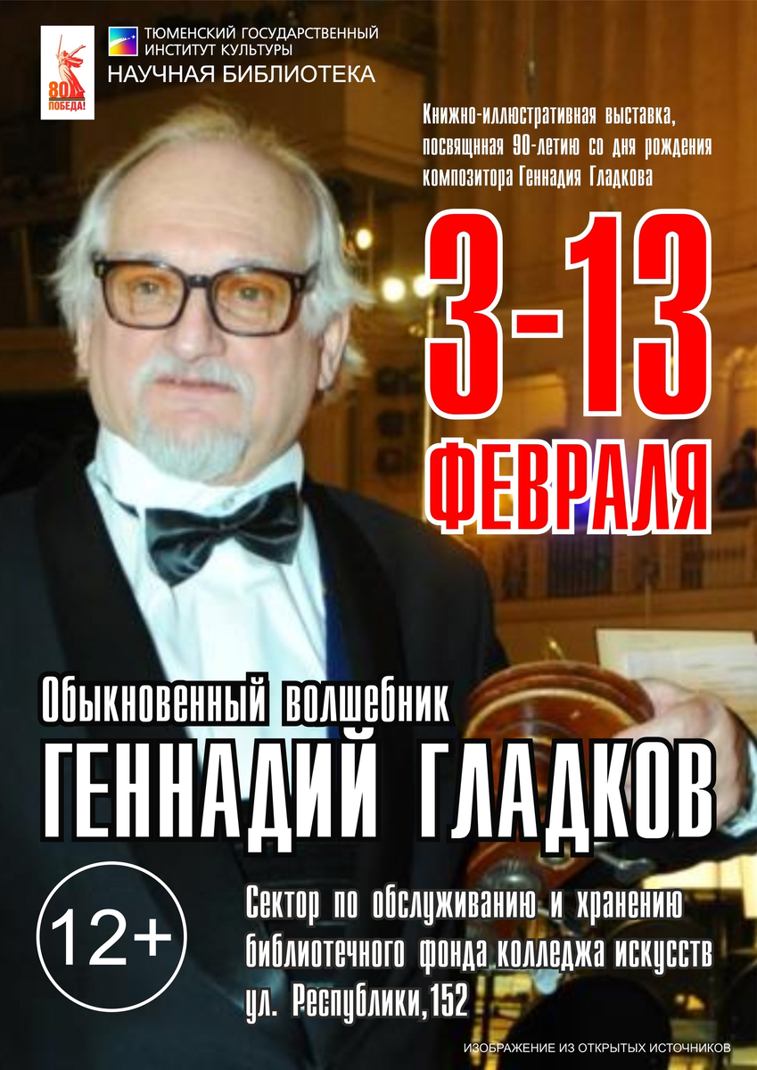 В читальном зале колледжа искусств (ул. Республики, 152, ауд. 1103) научной библиотеки ТГИК открыта книжно-иллюстративная выставка «Обыкновенный волшебник Геннадий Гладков», посвящённая 90-летию со дня рождения (1935–2023). Название выставки позаимствовано из документального фильма режиссёра Татьяны Маловой. В экспозиции представлены нотные сборники вокальных сочинений и детских песен из мультфильмов, музыкальные сказки, мюзиклы, грампластинки, видеокассеты известных отечественных фильмов – всё это объединено именем Геннадия Гладкова. Геннадий Игоревич Гладков – советский и российский композитор, народный артист России, лауреат множества музыкальных и театральных премий. Композитор внесён в Книгу рекордов Гиннеса по количеству написанных песен для детей. Центральной частью экспозиции стали «Бременские музыканты». Именно работа над этим мультфильмом (в 2024 году отмечался 55-летний юбилей) принесла Гладкову настоящую славу. Здесь – клавиры музыкальной фантазии «Бременские музыканты» и