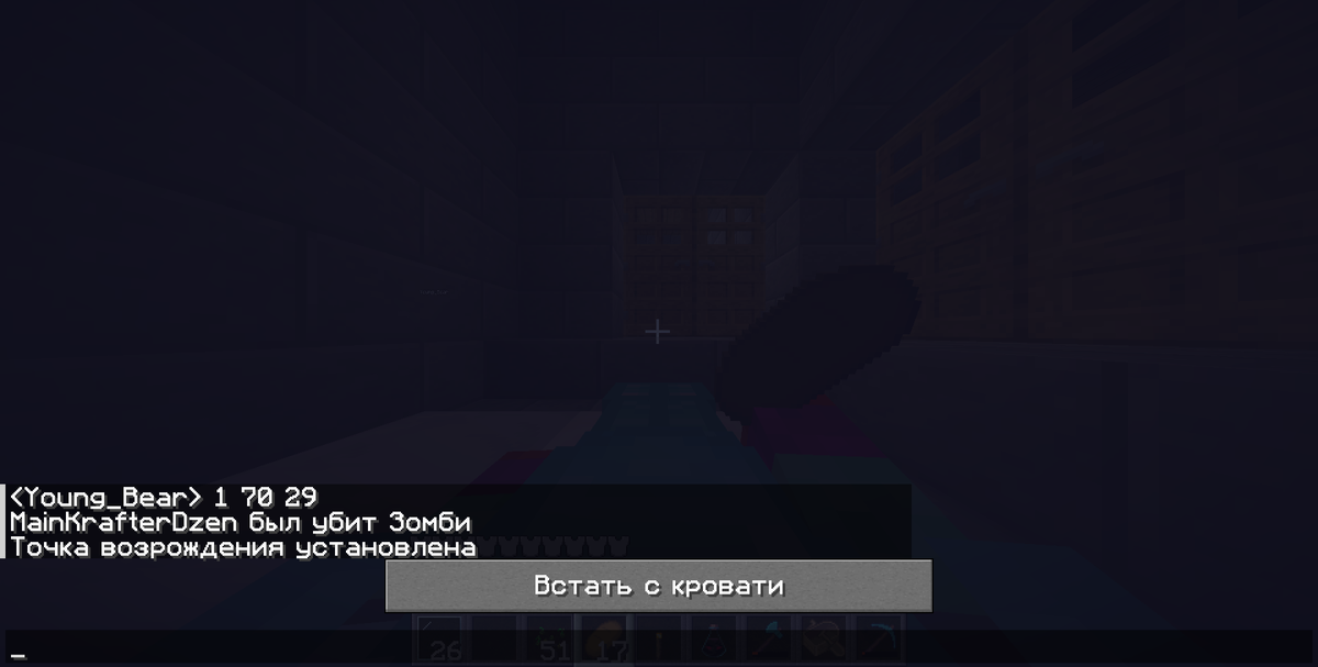Где 5 часть? Почему она не вышла? К сожаленью на моём пк возникла ошибка из-за нехватки свободной памяти пк, на момент 6 части, я почистил память, так что тут скрины будут.В 5 части ничего эпического нет, ничего важного вы не упустили, ну кроме того что пришлось закончить в пещере в которой много монстров. Заспавнился я на блоках, ко мне подошли зомби, а где наша деревня я не знаю, поэтому я спросил у Янга где она, он мне скинул корды. Я сломал блок и начал бегать от зомби возле лавового столба. Кстати, на дзен канале был ролик про это (тык). потом побежал на корды. Как только я добежал, началась ночь и мы её скипнули. Потом мы решили сделать реванш рейда, привезли жителя (да, мы всё таки смогли привезти одного) и так как только у меня была бутылка, Янг попросил меня её выпить. И у нас ничего не вышло.... Поэтому мы решили провести рейд в ранее найденной деревни. Мы легли спать, так как сразу после того как мы туда пришли началась ночь. Кстати, когда я поставил кровать, произошёл баг,
