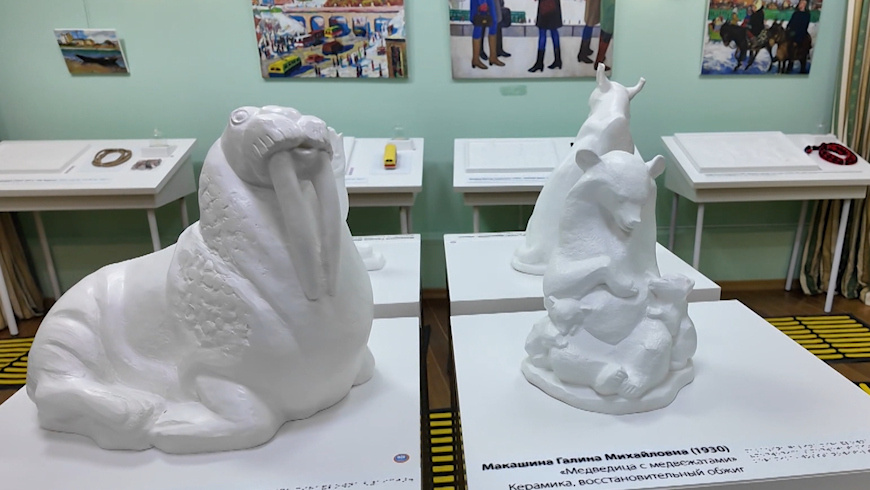 В Ханты-Мансийске открылась выставка, которая позволит прикоснуться к искусству. Познакомиться с картинами и проникнуться их атмосферой сможет даже слабовидящий человек. Здесь вы не услышите просьбу не трогать экспонаты руками. У каждой картины — своя тактильная модель и предмет-ассоциация. Для незрячего посетителя это возможность представить, как выглядят полотна известных новосибирских художников, ощутить даже мелкие детали. А для других — интересный эксперимент. — Варежка. Возможно, зима изображена. Люди где-то по улице идут зимой. Как будто несколько человек. — А теперь откройте глаза и посмотрите на картину. Так вы ее себе представляли? — Да, группа людей гуляет по улице. Интересно. Над фигурами животных работали профессиональные новосибирские скульпторы. Их создали с использованием 3D-технологий. А картины для выставки — дело кисти художников, которые работали с середины двадцатого века до наших дней. Организаторы выбрали полотна с незамысловатым сюжетом, чтобы невидящему человек