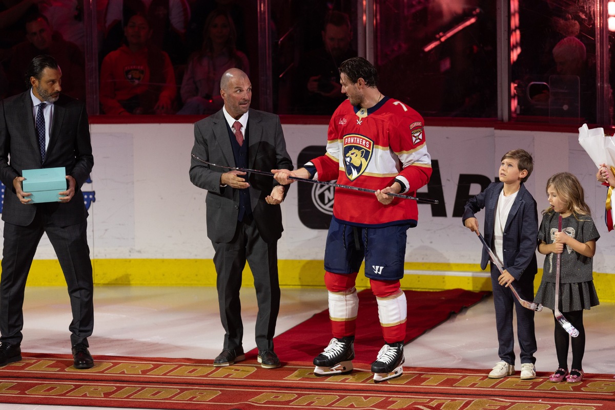 «Флорида» провела церемонию в честь 1000 игр Куликова в НХЛ. Защитнику вручили серебряную клюшку, все партнеры надели свитеры с его фамилией
