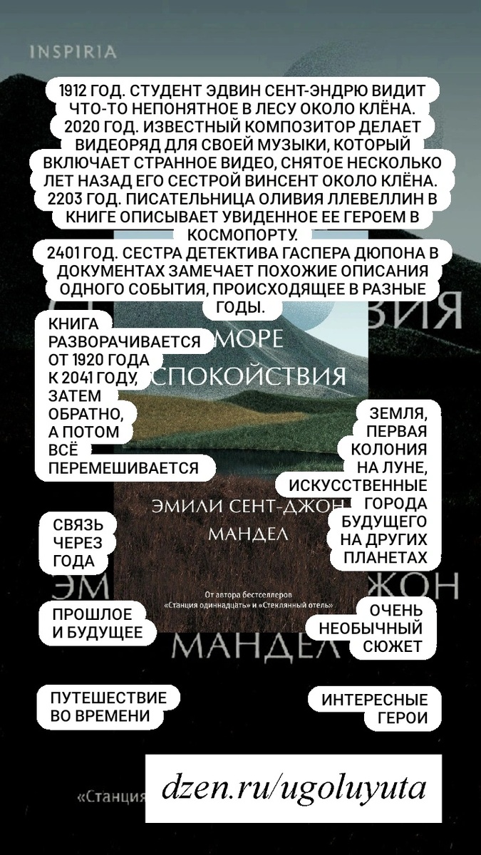 Прочитала "Море спокойствия". Очень мне понравилась книга. Похоже на "Эффект бабочки", "Патруль времени" и немного на "Облачный атлас". 4 временных линии от 1912 до 2401 года, которые оказываются связаны. Мне даже показалось что книга слишком быстро закончилась, хотелось читать её еще. С автором до этого не была знакома, взяла на заметку её книги.