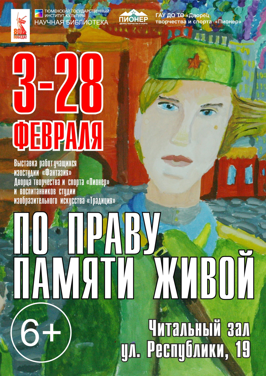 В читальном зале (ул. Республика, 19 ауд. 109) и экспозиционном пространстве научной библиотеки ТГИК открылась художественная выставка «По праву памяти живой» воспитанников изостудии «Фантазия» Дворца творчества и спорта «Пионер» и студии изобразительных искусств «Традиция». Выставка посвящена 80-летию Победы в Великой Отечественной войне и приурочена к Году защитника Отечества.
