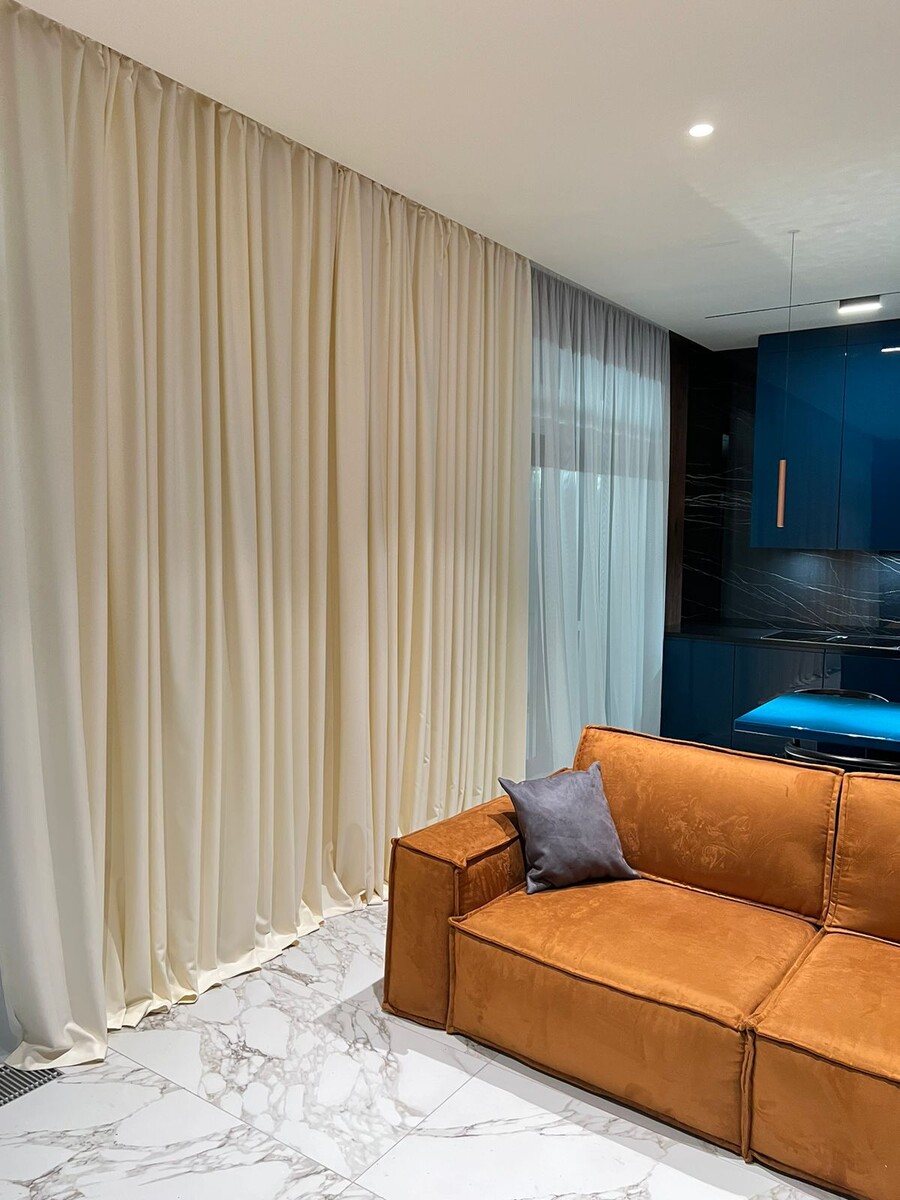 - Важно: оставляйте максимум 1 см от пола. Это тот минимальный просвет, который считается нормальным и эстетично выглядит. Если просвет больше, шторы могут выглядеть неаккуратно.