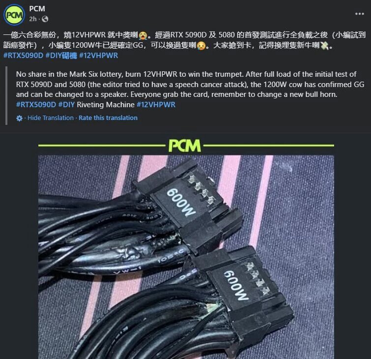 До релиза новых видеокарт NVIDIA RTX 5090 "зеленые" сообщили, что обновленные разъемы 16-pin 12V 2x6 не пожароопасны, но это не касается 12VHPWR, а сейчас обозреватели из PCM сообщают, что один такой кабель у них все-таки оплавился. Издание заявляет, что обнаружены проблемы с кабелем были после некоторого времени тестирования RTX 5090D и RTX 5080 в паре с блоком питания на 1200 Вт. Поврежденный кабель выглядит следующим образом. Видеокарты в рамках тестов, судя по всему, значительно не пострадали, но вот блоку питания повезло меньше — он отправился на помойку. Чуть позже авторы отметили, что в тестах также участвовали RTX 4090 и RTX 4080, а повреждения были обнаружены и на пинах на стороне видеокарт. Машинный перевод может упускать какие-то детали, но обозреватели использовали старый кабель 12VHPWR, который как раз и горел в паре с RTX 4090. Напомним, что RTX 5090 требует более 570 Вт только для себя, а потому и блок питания в системе должен быть соответствующий. Также важно иметь БП с