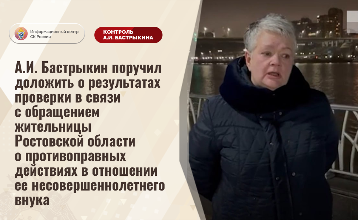 А.И. Бастрыкин поручил доложить о результатах проверки в связи с обращением жительницы Ростовской области о противоправных действиях в отношении ее несовершеннолетнего внука В сети Интернет размещено видеообращение к Председателю СК России А.И. Бастрыкину жительницы Ростовской области. Она выражает несогласие с результатами установления обстоятельств избиения ее 16-летнего внука руководством одного из образовательных учреждений в октябре 2023 года в городе Шахты. Несмотря на то, что указанные противоправные действия совершены в присутствии очевидцев и подтверждаются судебно-медицинской экспертизой, уголовное дело по данному факту не возбуждено, фигуранты к ответственности не привлечены. Ранее указанная ситуация освещалась в СМИ. В СУ СК России по Ростовской области по данному факту проводилась процессуальная проверка, по ее итогам в возбуждении уголовного дела отказано. Председатель Следственного комитета Российской Федерации Александр Иванович Бастрыкин поручил руководителю СУ СК Росс