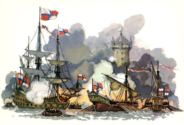 Шестидесятитысячная турецко-татарская армия, стоявшая под начальством крымского султана Нуреддина и Муртазы-паши за рекой Кагальник, в десяти верстах от Азова, шесть раз нападала на войско царя Петра. Особенно кровопролитными были битвы десятого и двадцать четвертого июня. Неприятель двадцать четвертого июня подошел к лагерю на картечный выстрел и бросился на нашу пехоту. Петровские полки построились для стрельбы, согласно устава. Передняя шеренга стреляла, задние готовили ружья. Убийственный ружейный огонь открылся вдоль осаждающих войск. Часто стали падать турки, убитые и раненые. И не выдержали. С отчаянными криками: «Алла! Алла!» - они побежали. Тогда вылетели из-под флангов донские казаки и на конях атаковали турок с шашками в руках. За конницей бежала пехота. Несколько легких орудий вылетело вперед. Смешавшиеся, потерявшие строй турки кинулись к реке Кагальник, но здесь остановились на берегу тенистой и глубокой речки. Казаки рубили их, пехота стреляла по ним «в припор ружьями», их сталкивали в воду и топили. Немногим удалось спастись…