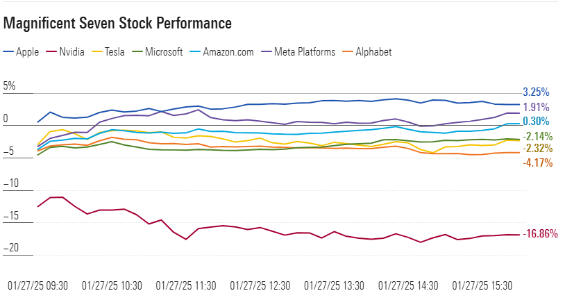 Технологические акции подверглись сильному удару. Все "семь технологических гигантов" - Apple, Nvidia, Tesla, Microsoft, Amazon, Meta (бывший Facebook) и Alphabet (Google) - понесли убытки, причем акции Nvidia упали на рекордную величину на Уолл-стрит, упав почти на 17% за день.
